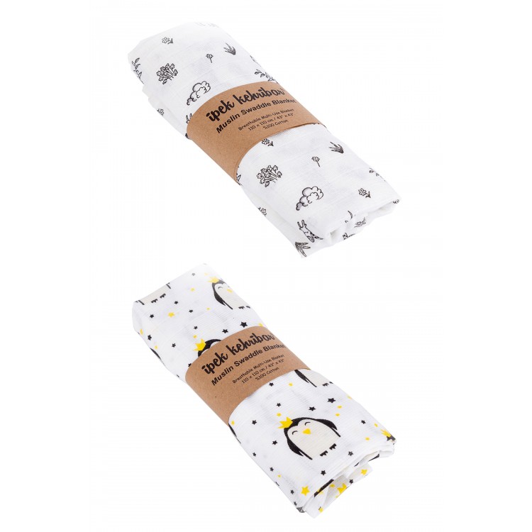 ipek kehribar Muslin Kiz Erkek Bebek Kundak Battaniyesi %100 Pamuk Ultra Yumusak Cok Amacli Puset Ortusu 2 Paket (Penguen ve Zürafa ) ipek-923