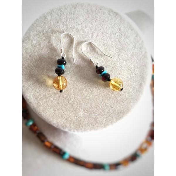 İpek Kehribar 2 Renk Turkuaz Detaylı Sertifikalı Hakiki Baltık Damla Kehribar Küpe ipek-755