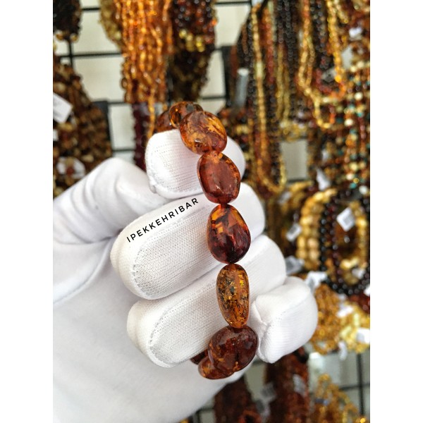 İpek Kehribar Konyak Renk Yassı Kesim Sertifikalı Hakiki Baltık Damla Kehribar Bileklik Unisex Kadın Erkek ipek-305