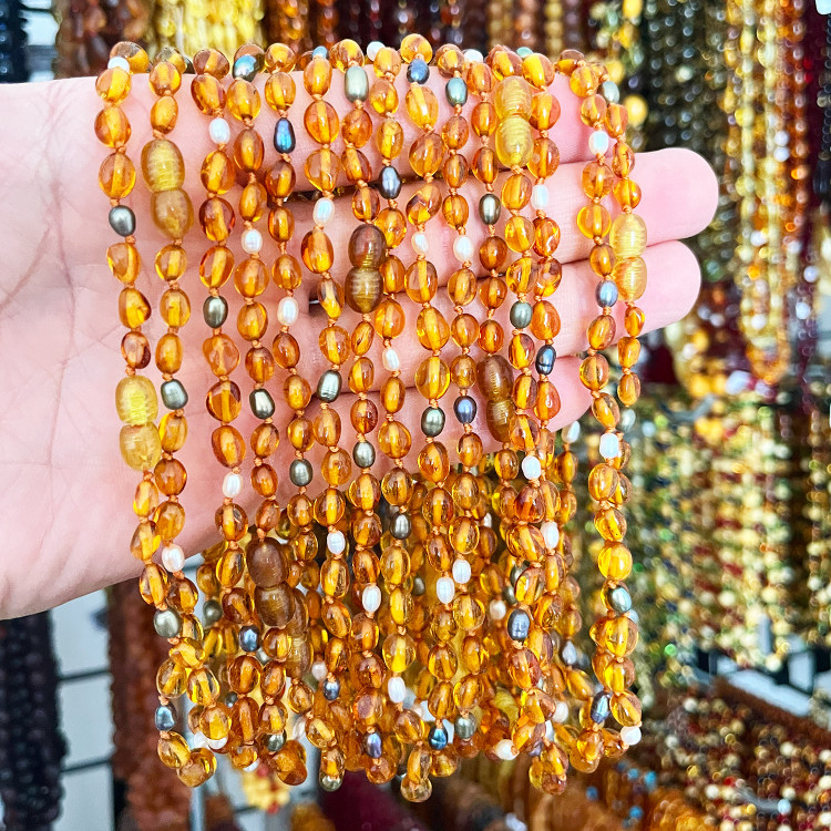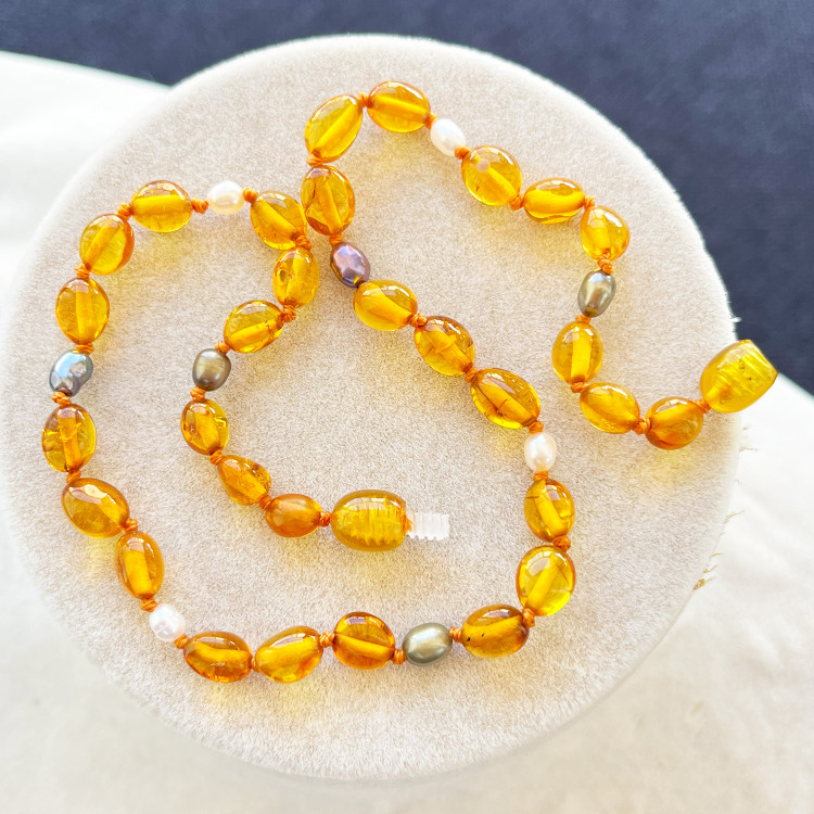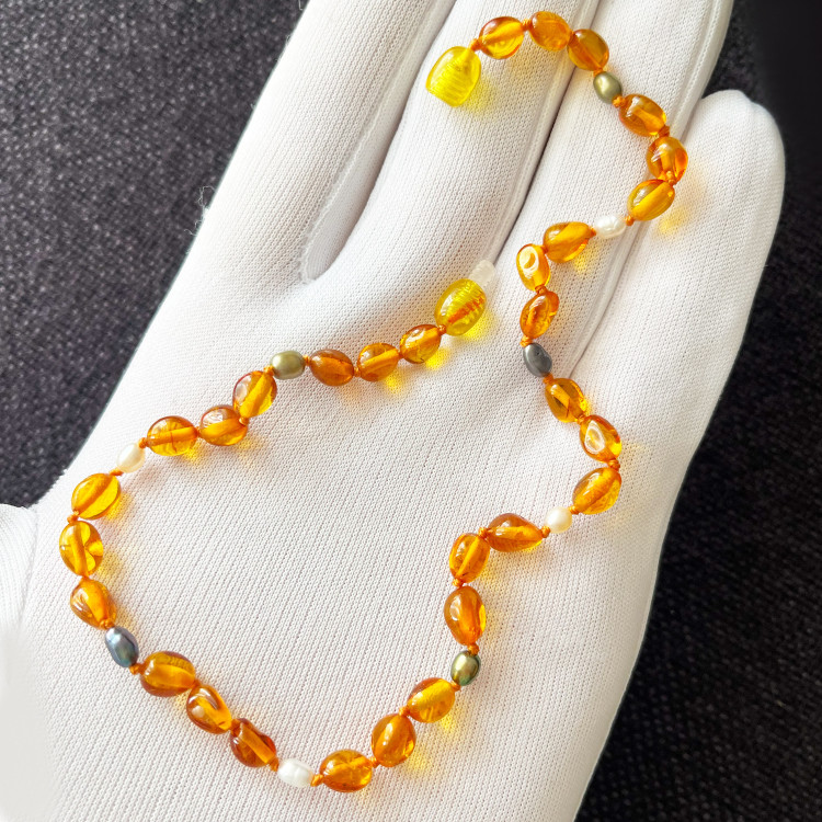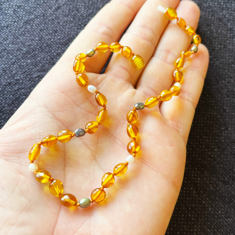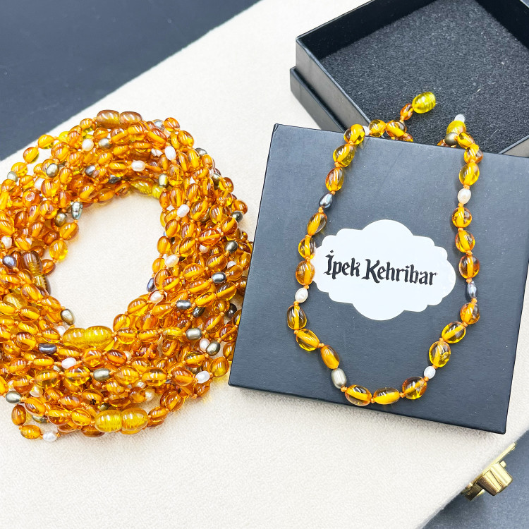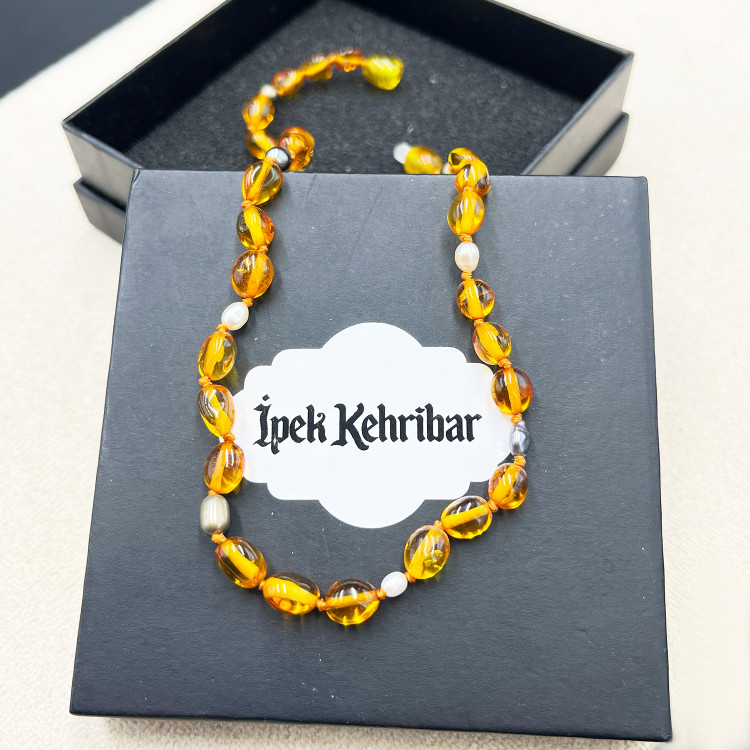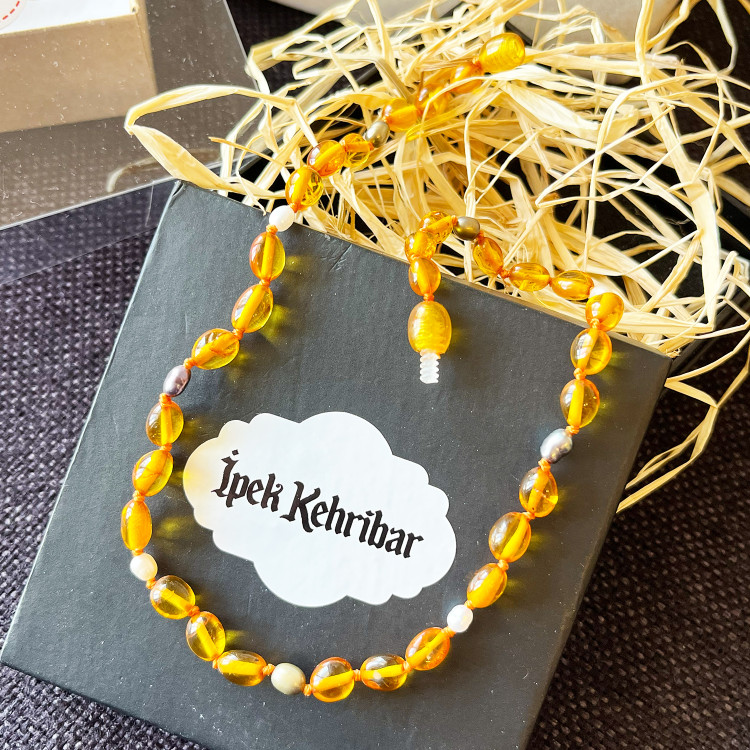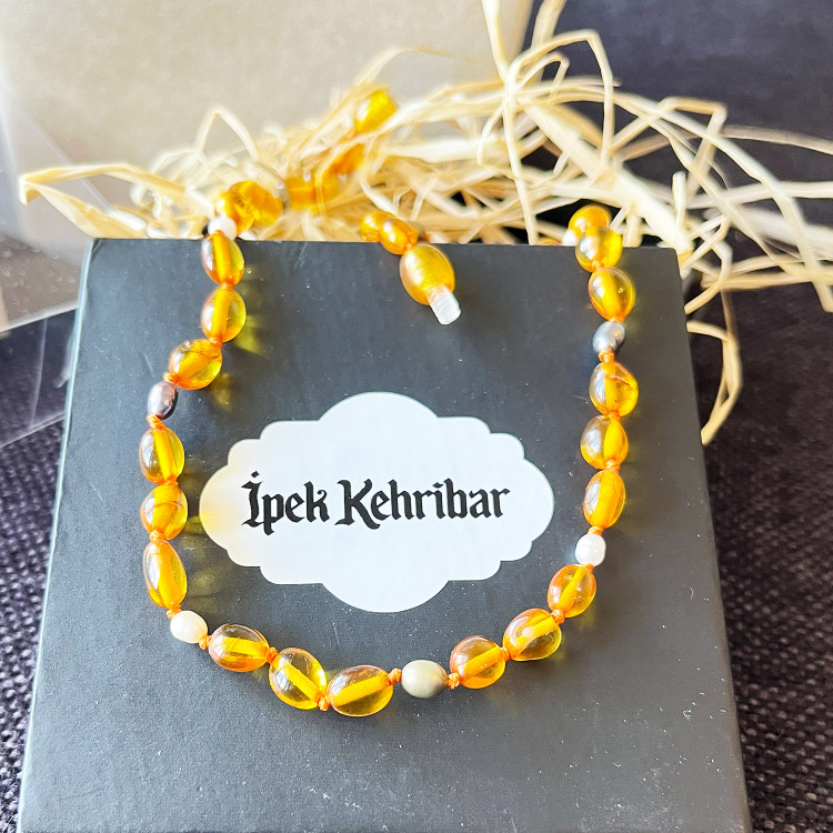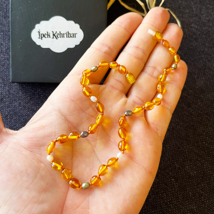 Sertifikalı Baltık Damla Kehribar Bebek ve Çocuk Diş Kolyesi (İnci Taş Kombinasyonlu, Yassı Kesim)