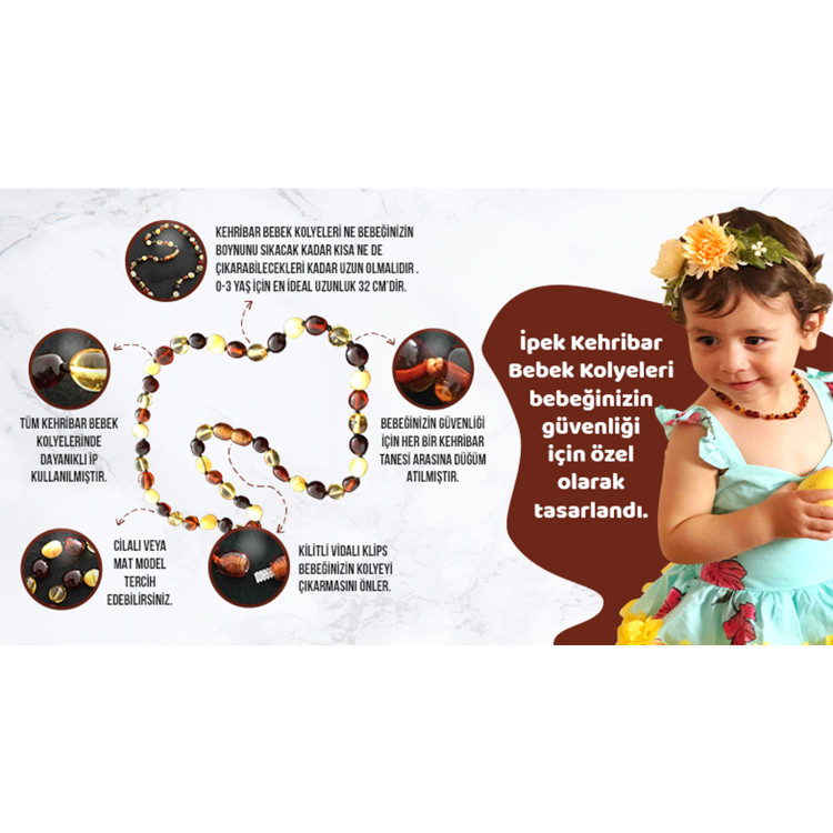 İpek Kehribar Ekibi olarak satmış olduğumuz kehribar bebek kolyeleri bebeğinizin güvenliği için her bir boncuk arası ayrı ayrı düğümlenmiştir. Dayanıklı iplikten yapılmış ve vidalı klips kullanılmıştır. Kilitli vidalı klips Bebeğinizin kolyesini çıkarmasını önleyebilmek içindir. Ayrı ayrı düğümlenmesinin amacı; Olası kehribar tanesinin kopması veya kırılması durumunda ebeveynlerin düşen boncuğu bulmasına yardımcı olabilmektir.