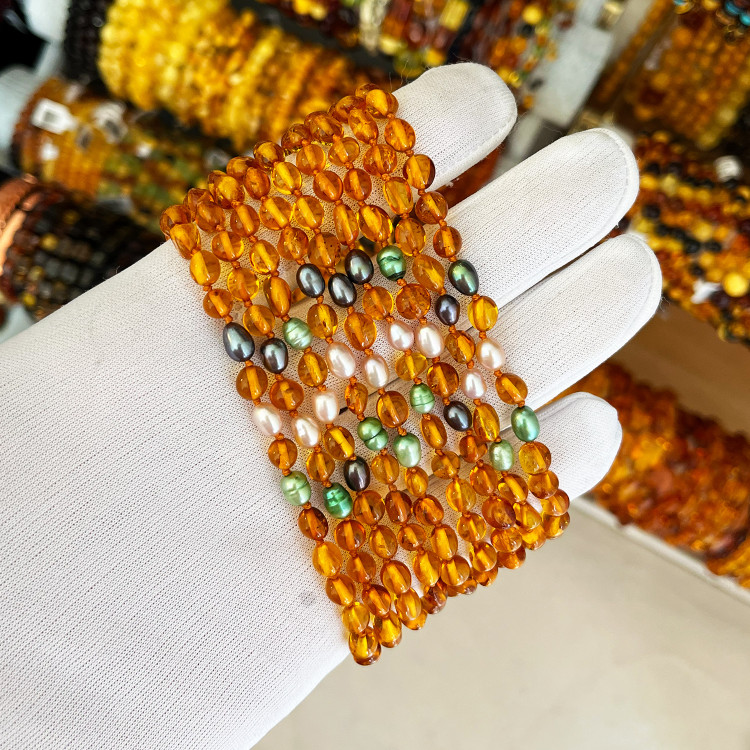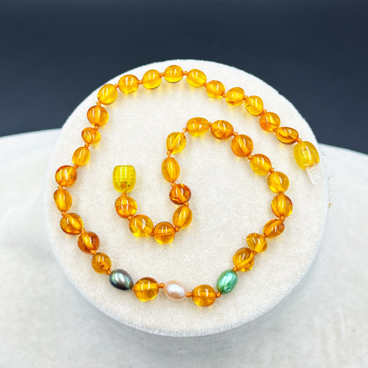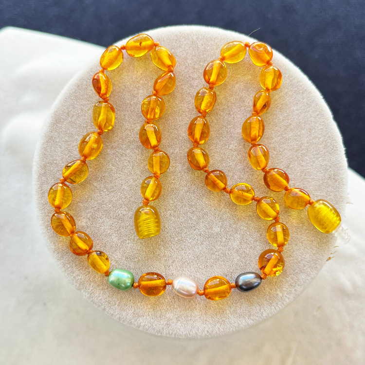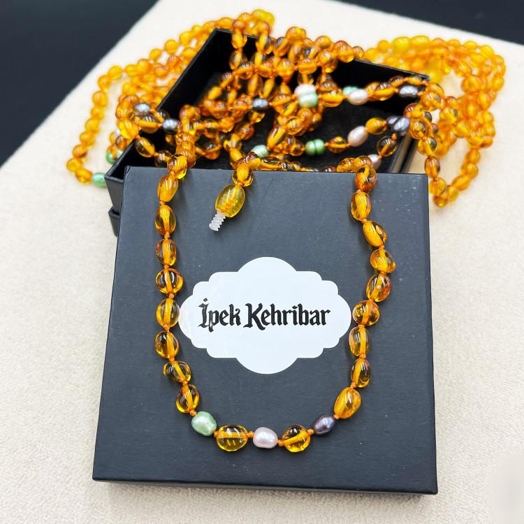 Malzeme : Baltık Kehribar – Baltic Amber (Not: Kolye ucunda yer alan inci taneli renkli detaylar kehribar değildir; yalnızca görsel zenginlik katması için dekoratif amaçlı eklenmiştir.)