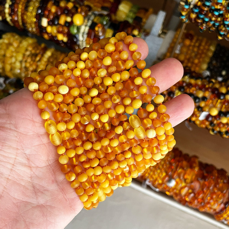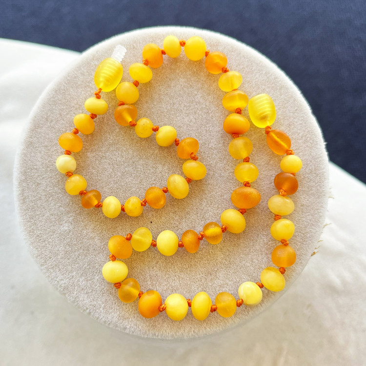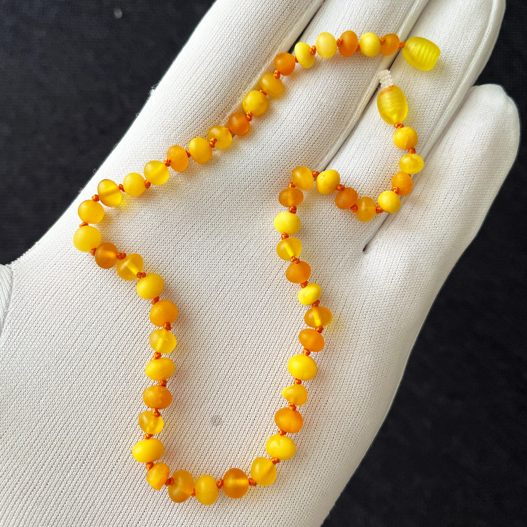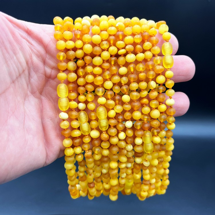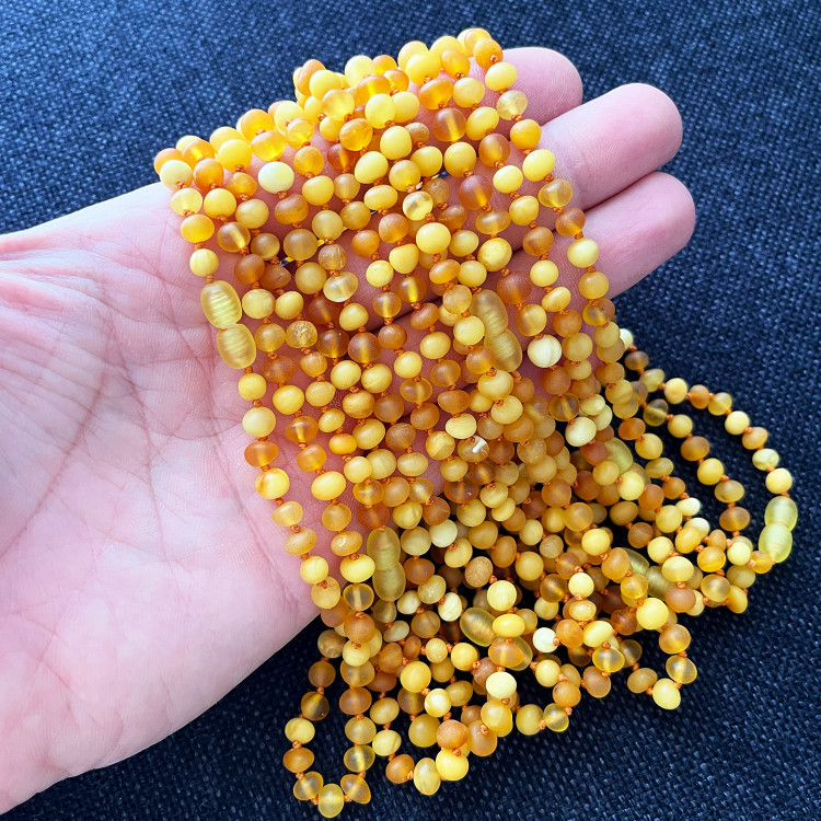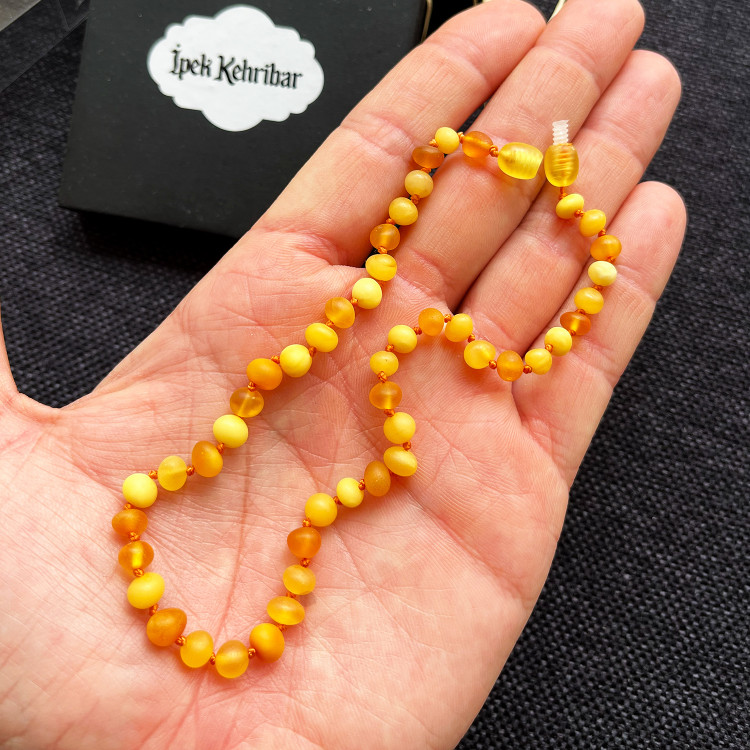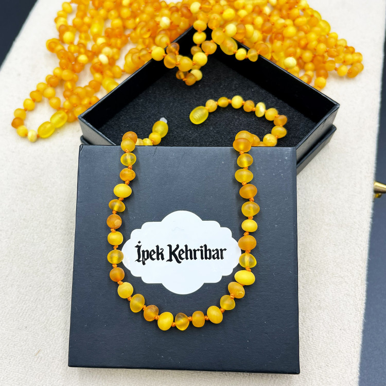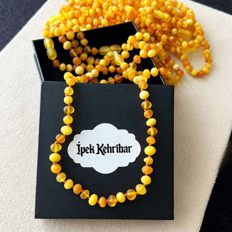 Sertifikalı Baltık Damla Kehribar Bebek ve Çocuk Diş Kolyesi (Mat Konyak-Karamel-Beyaz, Yuvarlak Kesim)