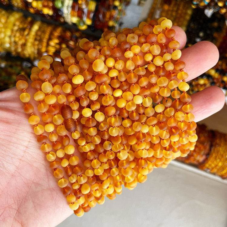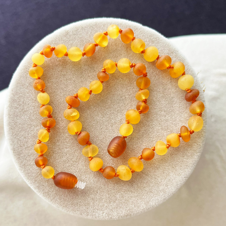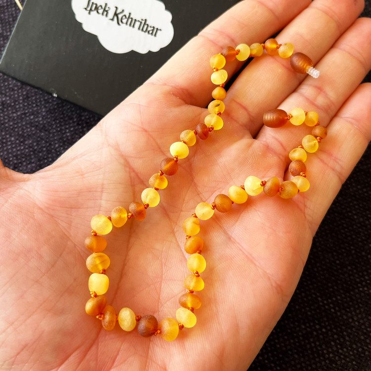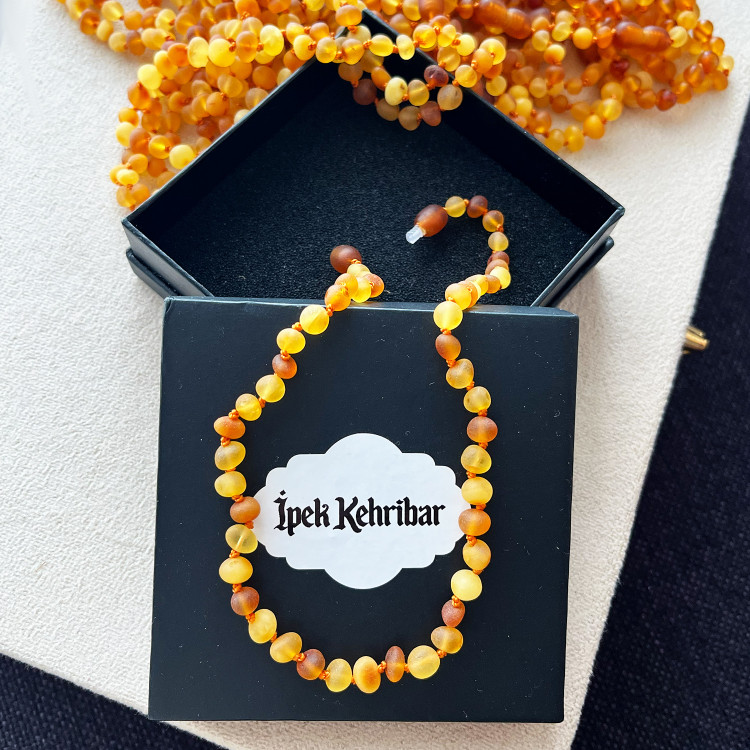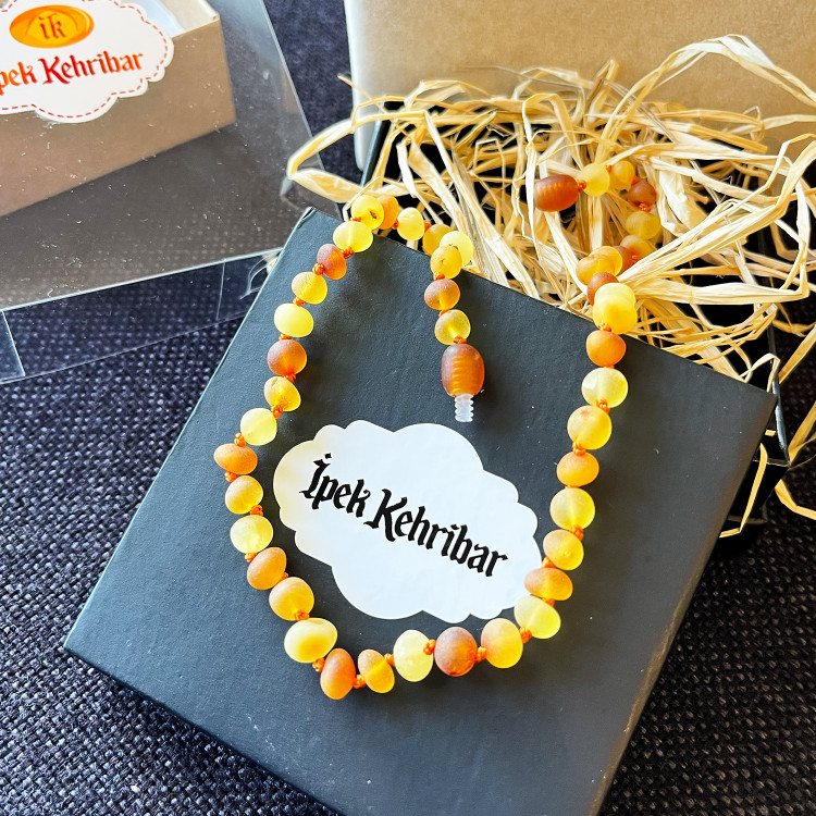 Sertifikalı Baltık Damla Kehribar Bebek ve Çocuk Diş Kolyesi (Mat Limon-Konyak-Karamel, Yuvarlak Kesim)